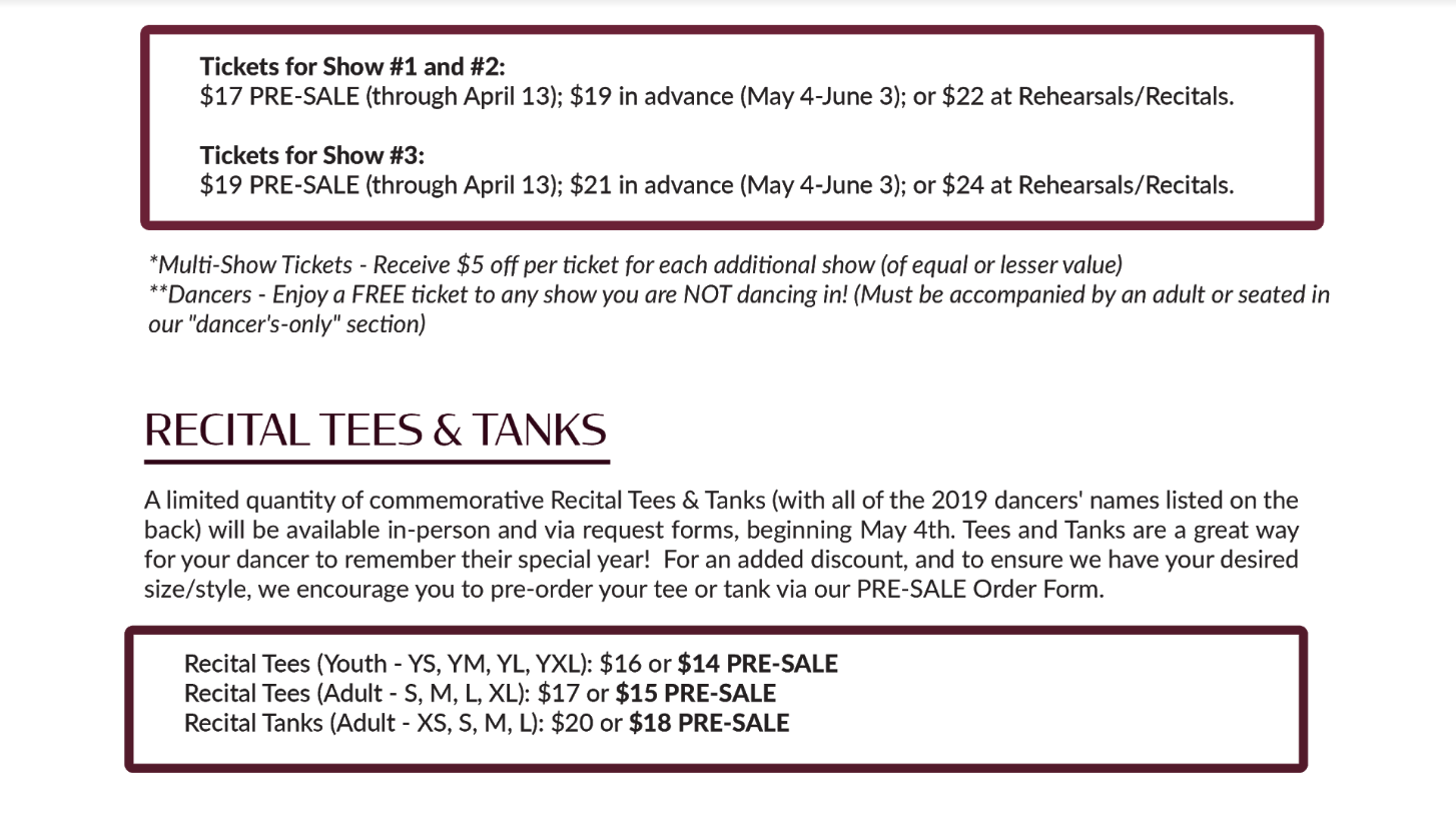 PRE-SALE Order Forms and Online Orders will be time-stamped as they are received, however, orders will NOT be filled until AFTER all in-person tickets have been purchased during Ticket Sale Day from 8am-1pm at the studio on Saturday, May 4th.